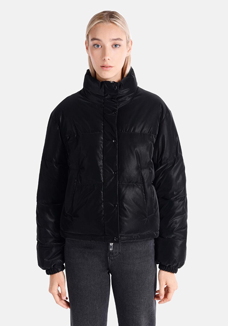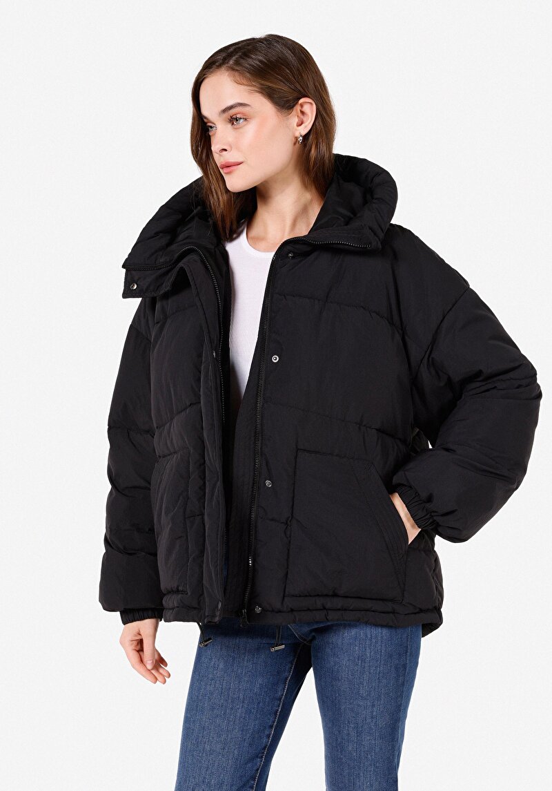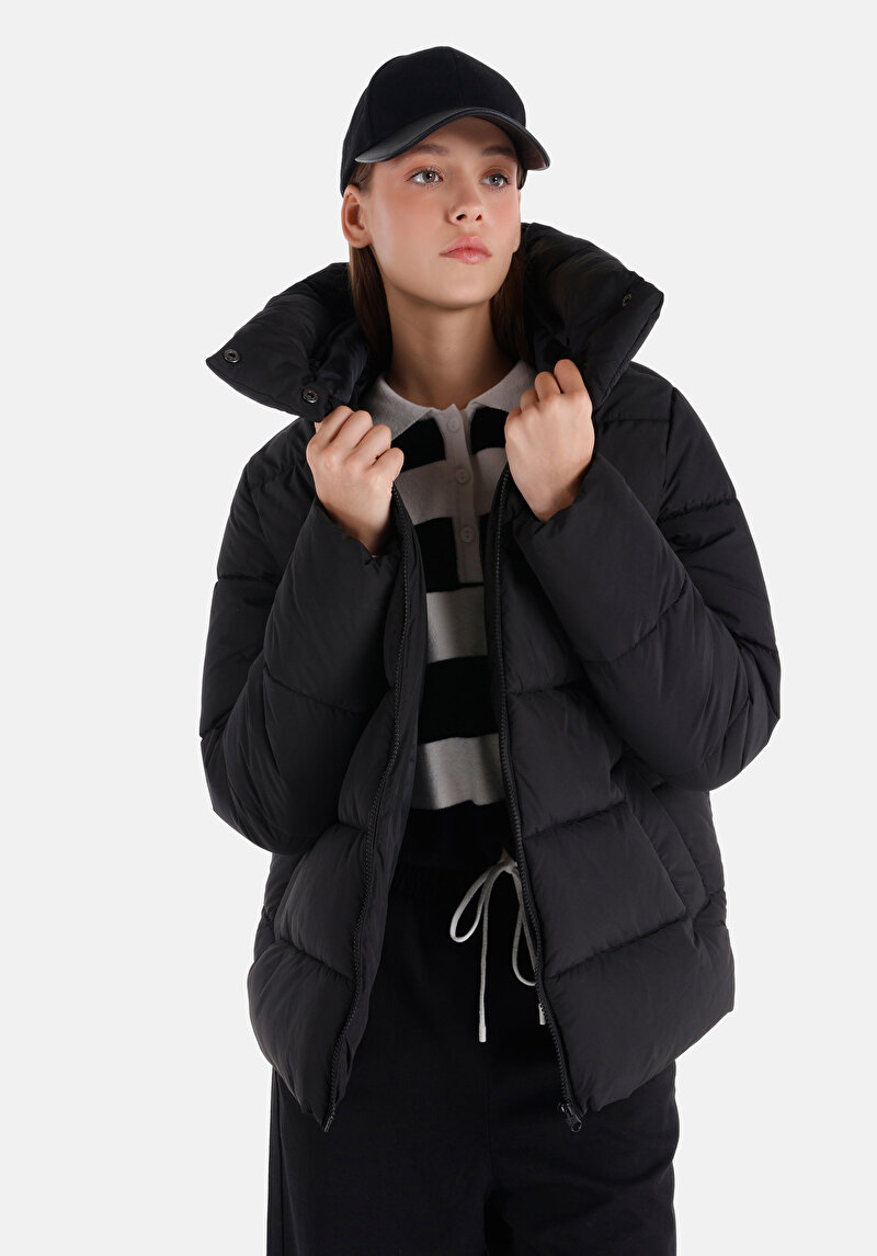 Женское чёрное пальто обычного кроя с подкладкой и застёжкой-молнией
